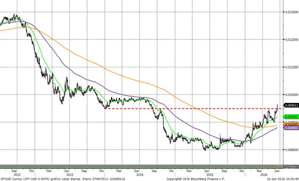 No obstante, los índices de renta variable de Estados Unidos corrigieron, pero sin contundencia. Ha sido esta madrugada cuando las bolsas asiáticas se han puesto muy nerviosas. La razón es que el YEN se disparó al alza tras la reunión del Banco de Japón. Los inversores entendían que el Banco de Japón podría estar preocupado por la fortaleza del YEN y trataría de hacer algo para evitarlo. Sin embargo, mantuvo sin cambios su política monetaria y se apegó a su visión optimista de la economía. Esto provocó que el YEN rompiera al alza la zona de resistencia clave que se puede ver en el gráfico del Yen frente al dólar. Viendo el gráfico, podemos entender la clara relación que hay entre la fortaleza del Yen y la debilidad de las bolsas globales y lo contrario. En el periodo 2012-2015, todos los activos de riesgo han subido con fuerza amparados en la debilidad del YEN y, desde que el YEN hizo suelo el verano pasado y está en tendencia alcista, los mercados de riesgo están en clara tendencia bajista. Todo esto viene explicado por el Carry trade.