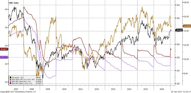 Sucesivas ampliaciones de capital, omisión de reparto de dividendos, emisión de bonos convertibles e híbridos financieros perseguían este objetivo de reforzar balances. Así pues, estamos ante unos bancos menos rentables, pero no ante una banca insolvente. Y ya este trimestre estamos viendo que las pérdidas de algunos bancos se deben sólo a provisiones. Las tasas de morosidad están más controladas y el precio del ladrillo empieza a dar señales de recuperación, por lo que no parece que haya que seguir dotando provisiones para depreciación de estos activos. Cuando parecía que ya todo estaba provisionado, llegó la sentencia de las cláusulas suelo. Sea por lo que fuere, tras las cláusulas suelo parece que ya están todos los escenarios negativos descontados. Desde este punto de partida, todo apunta a que veremos un ritmo creciente en los beneficios por acción de la banca. Y esto, lo vimos la semana pasada, es fundamental para pensar que el PER estimado de 11,20x que presenta el sectorial bancario de la zona euro es barato. Este PER estimado es bastante atractivo, pero si los beneficios por acción siguen corrigiendo, el PER es caro.